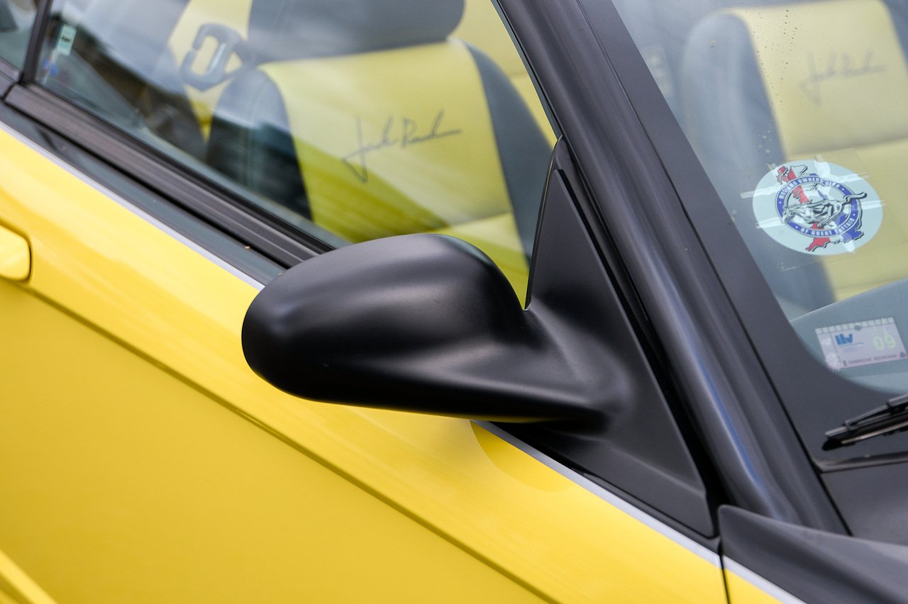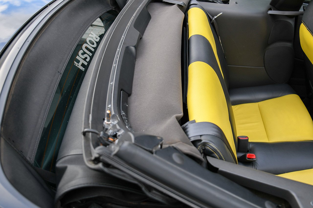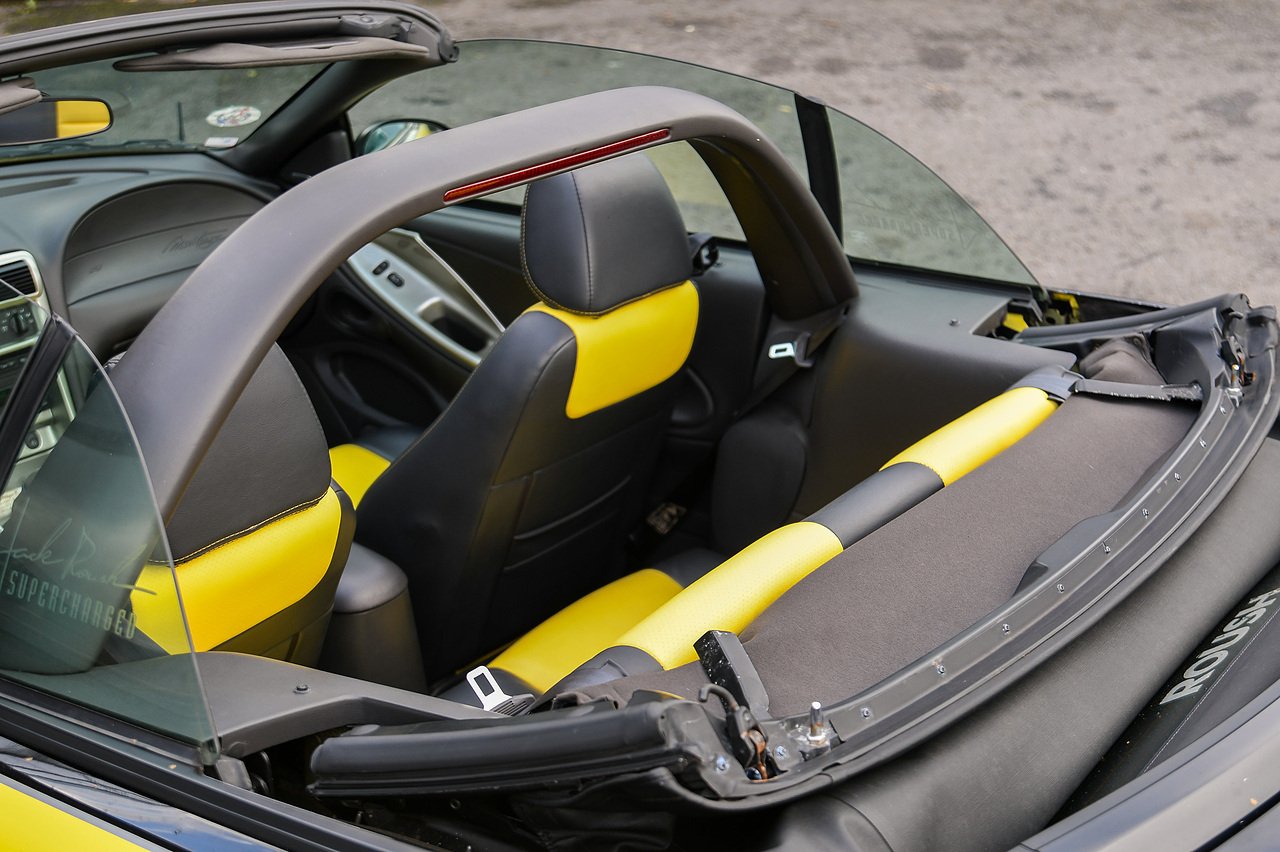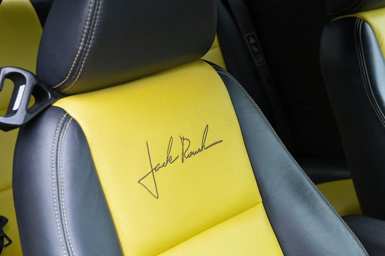 This Mustang Convertible GT is finished in an attention-grabbing two-tone Black and Zinc Yellow colour scheme with a black soft-top roof, over a Dark Charcoal and Yellow leather-trimmed interior, featuring yellow stitching, embroidered Jack Roush signatures on the front seat backs, and silver trim.