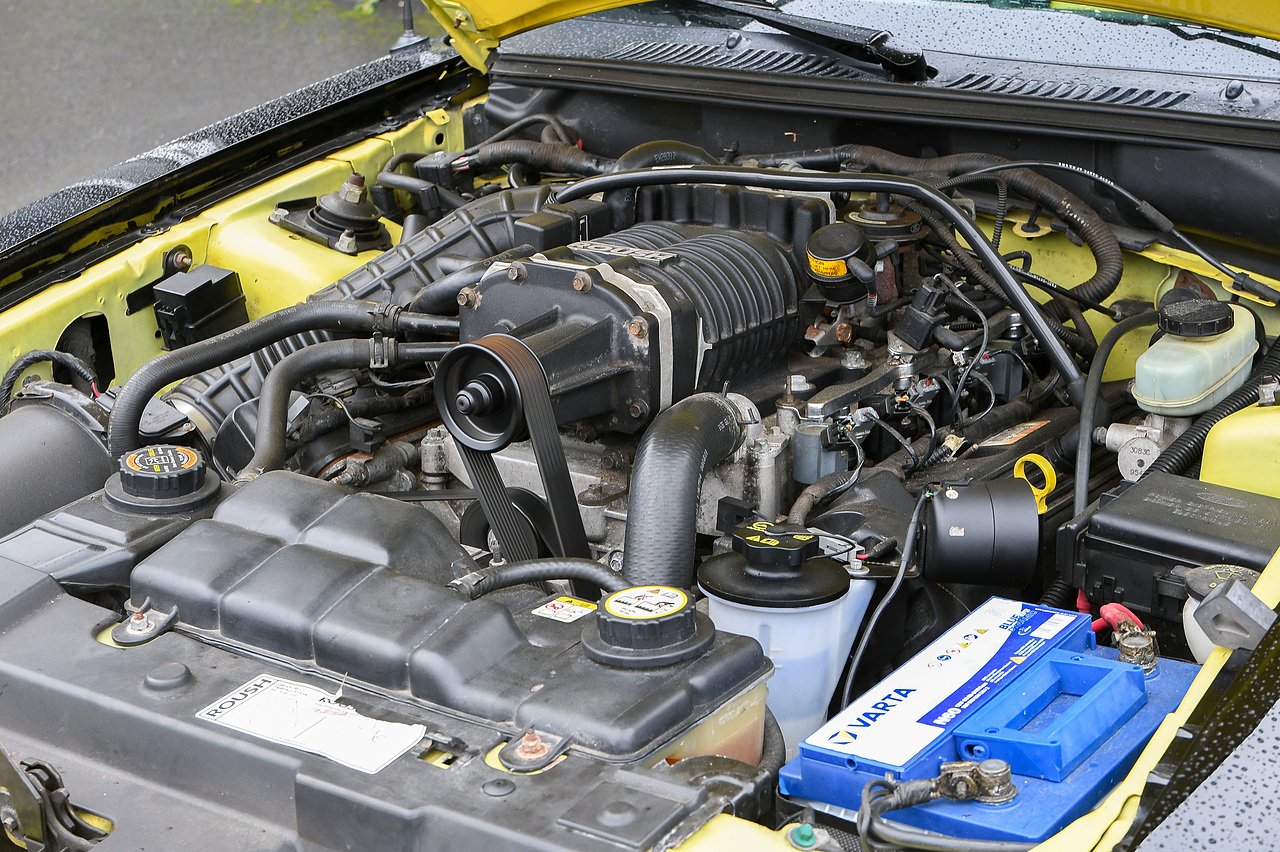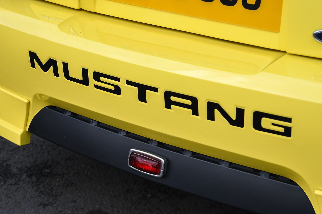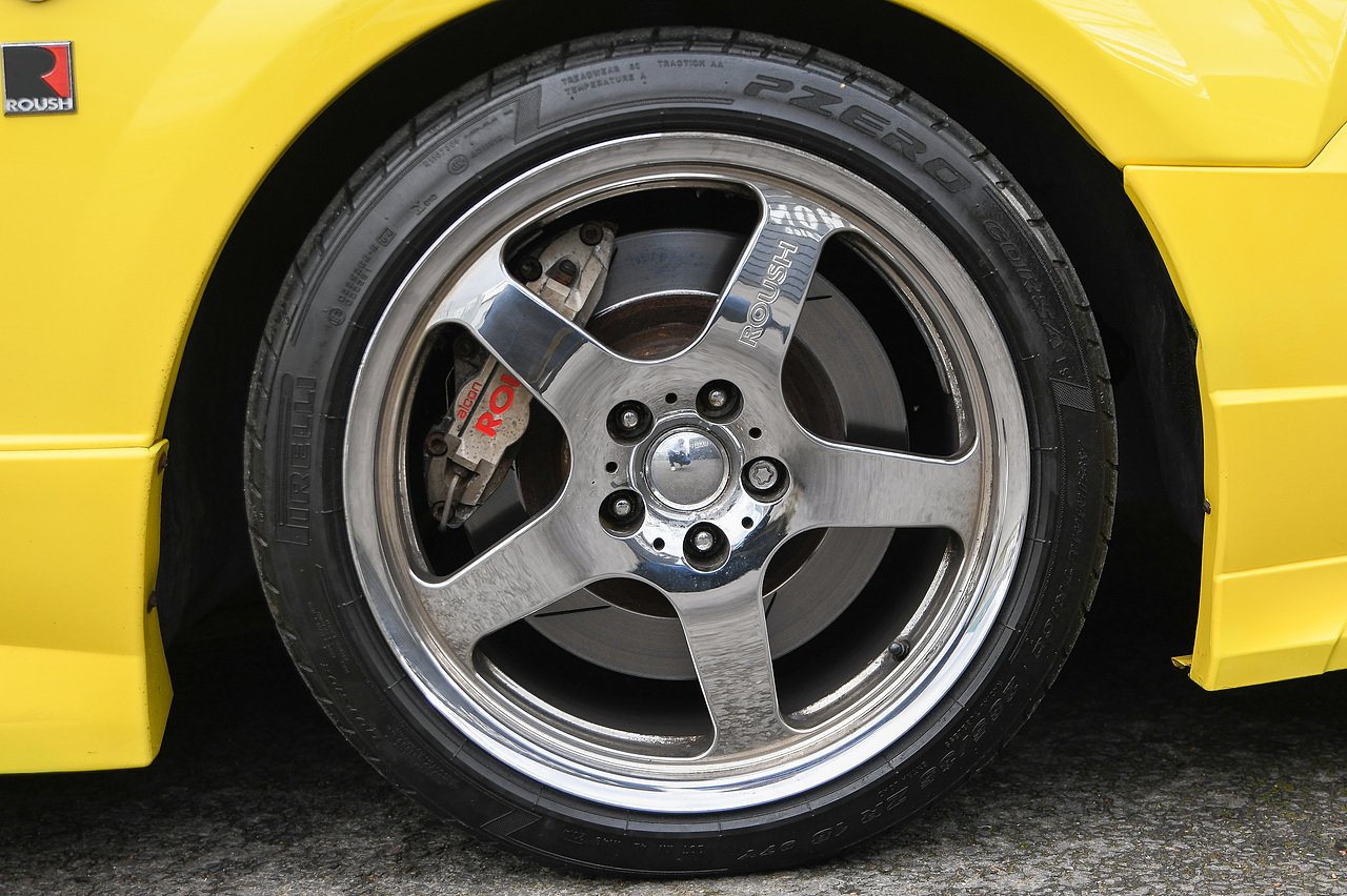 It rides on a set of 18-inch Roush five-spoke chrome alloy wheels, framing Roush-branded brake callipers, and shod in mixed Pirelli P Zero tyres.