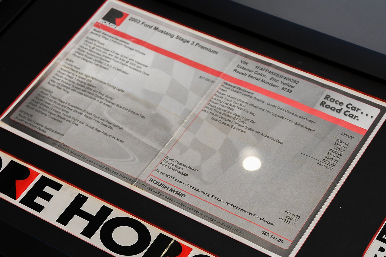 The car is accompanied by two keys, the V5C, the service booklet, framed original Roush windscreen sticker with full spec and prices totalling an incredible $60,700 in 2003!, the owner’s manuals in a black fabric wallet, Roush stickers, a Mustang interactive owner experience DVD, the stereo key card, a Roush VIN search printout, a US certificate of title, a selection of UK service and parts invoices, an MOT history printout, a Carfax report, a car cover, and all the historic MOT certificates