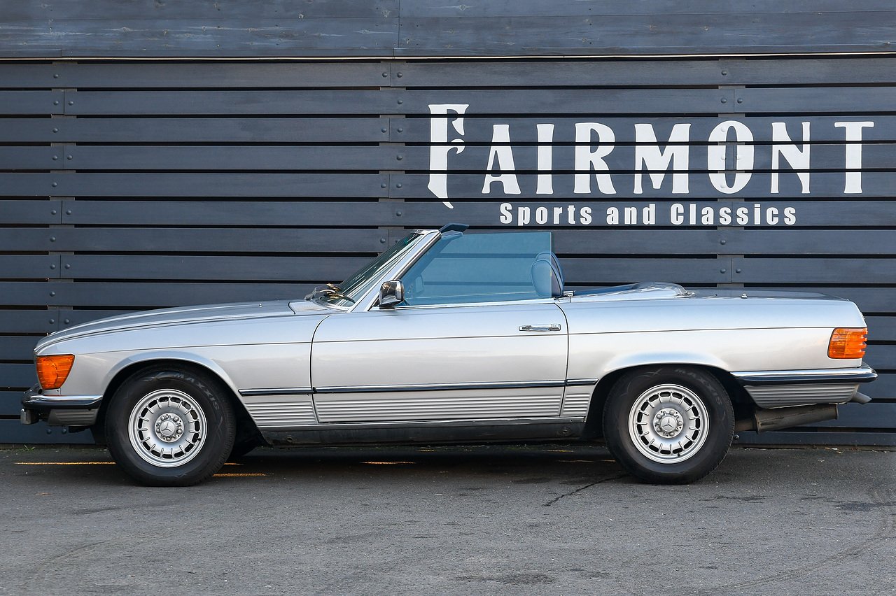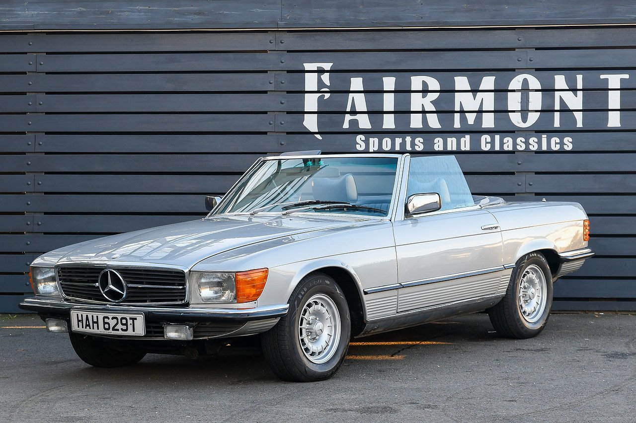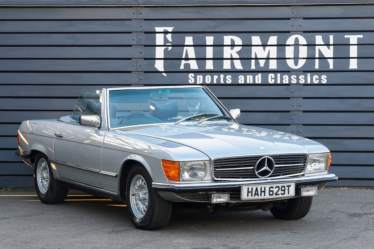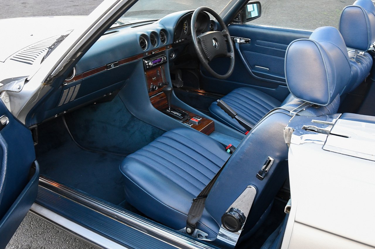 A genuine UK supplied Mercedes 350SL in fabulous condition, regardless of its age. It also has arguably the best Mercedes colour combination of Silver with Blue leather that looks fantastic, especially with the addition of the metallic blue hard-top.