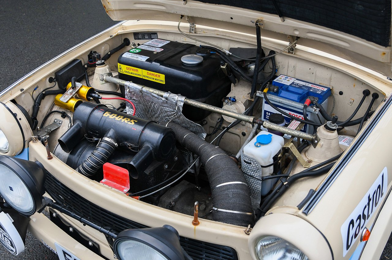 On the contrary to what you might think, rallying in GDR was serious and factories were required to build durable and fast cars at whatever cost. They remained two-stroke and based on the family run-around model, but they were seriously modified and engineered for competition. Uprated carburettors, expansion chambers, increased compression delivered double the standard cars horsepower. Chassis and suspension upgrades delivered improved handling, with a short gearbox and LSD. Together, this delivered a tiny, screaming rally weapon.