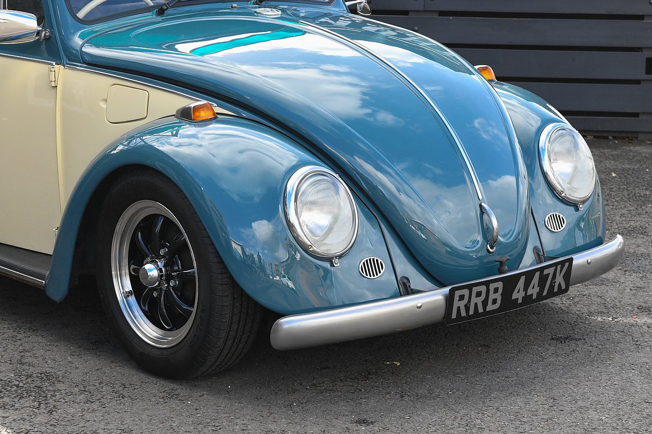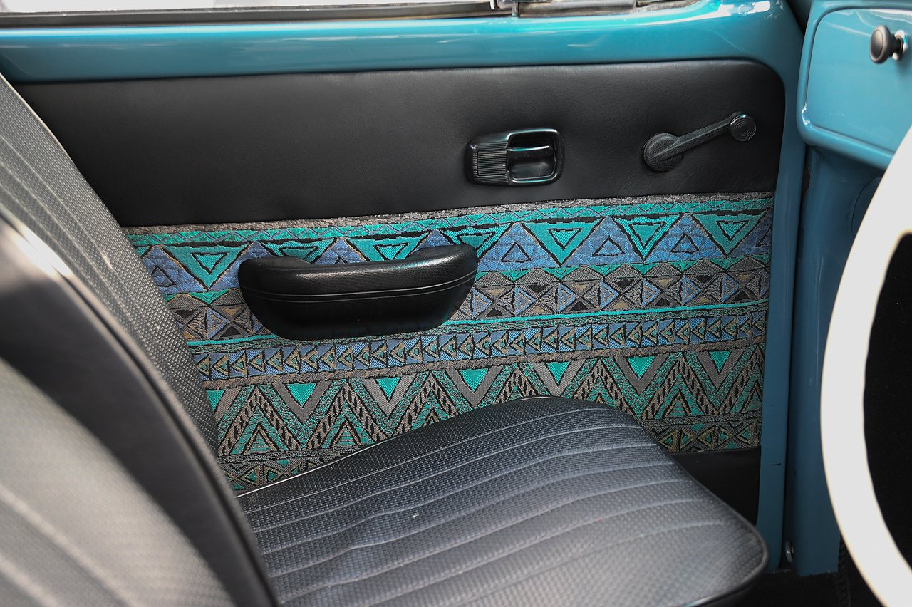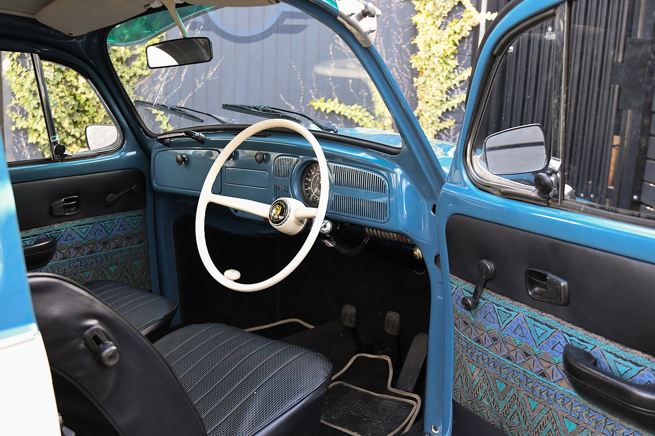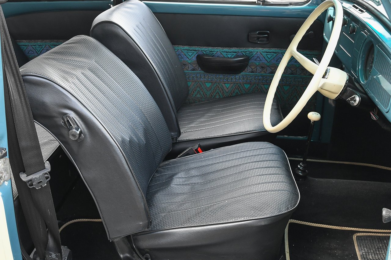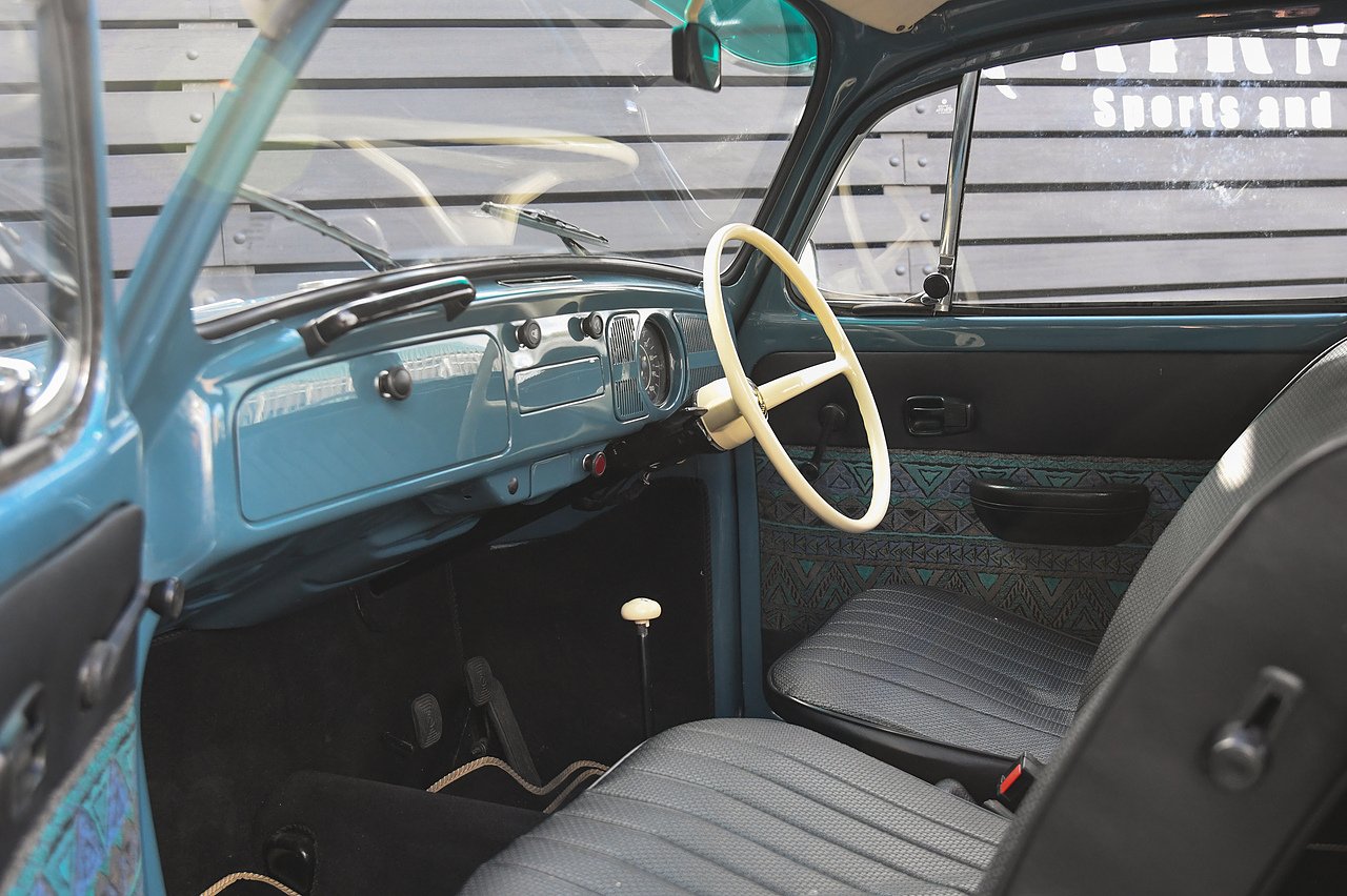 Our car is a 1971 1200, first registered on 16th November 1971. Presented in dove blue over ivory, it certainly looks the part of a stylish custom cruiser. It has a black upholstery with the dove blue exterior paint carried through to the inside alongside funky but subtle custom door cards. The headlining has been replaced and the alloy wheels in gloss black with chrome rims look just right with the lowered ride height.