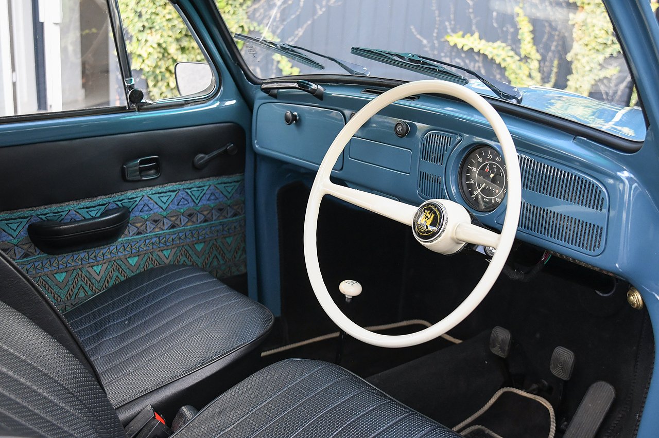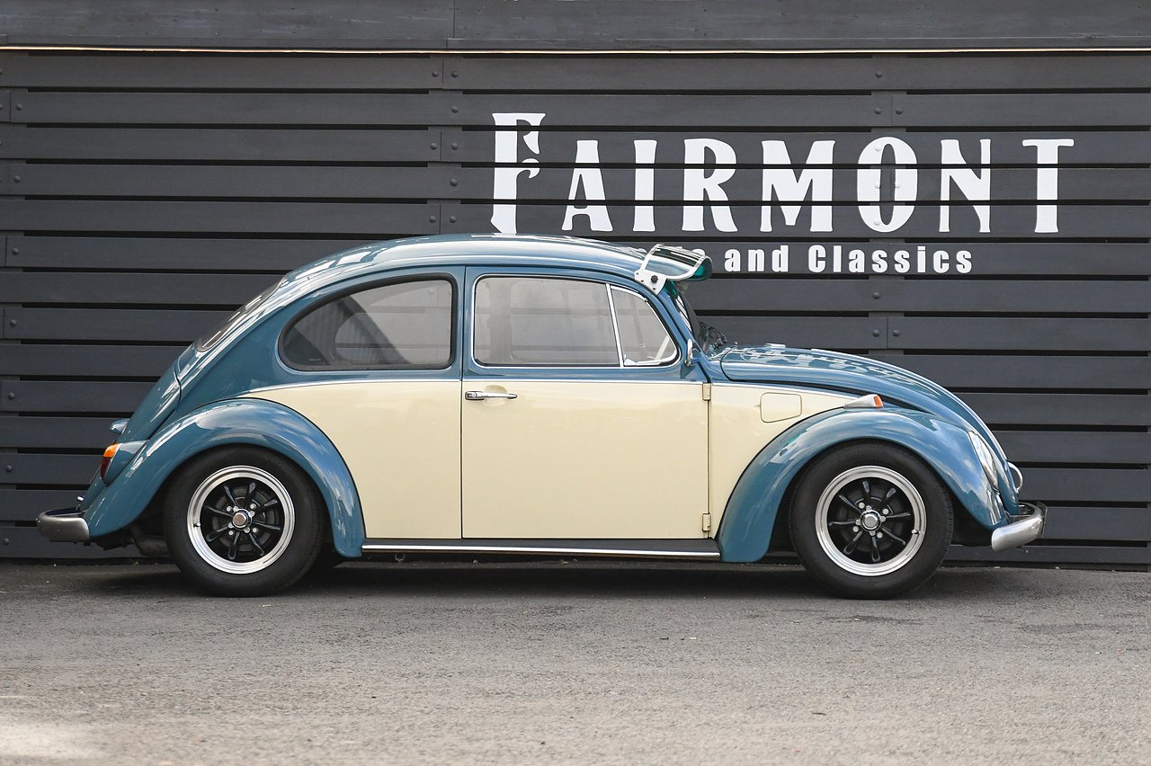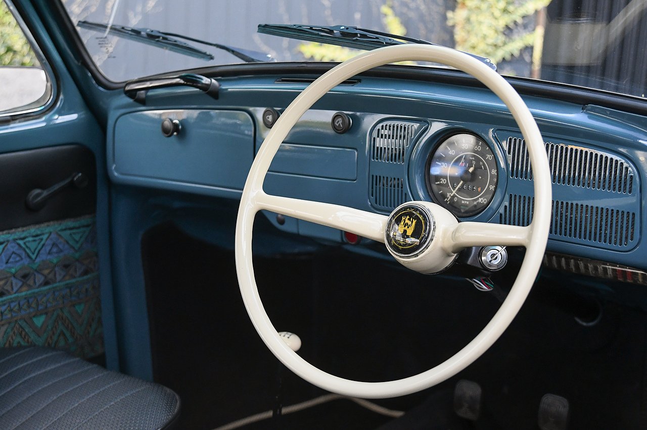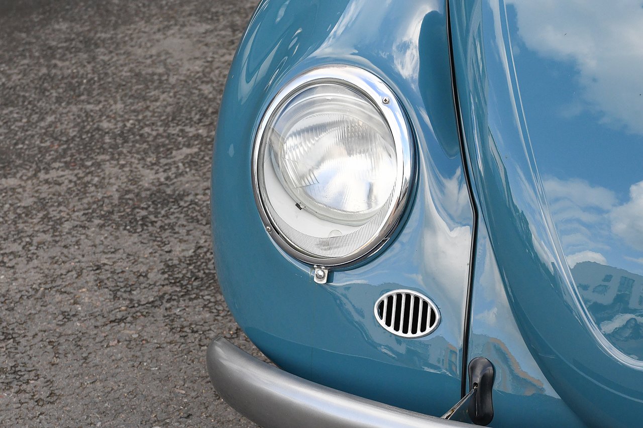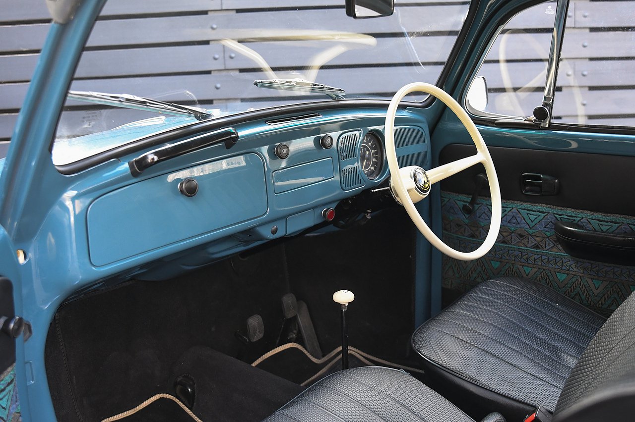 Our car is a 1971 1200, first registered on 16th November 1971. Presented in dove blue over ivory, it certainly looks the part of a stylish custom cruiser. It has a black upholstery with the dove blue exterior paint carried through to the inside alongside funky but subtle custom door cards. The headlining has been replaced and the alloy wheels in gloss black with chrome rims look just right with the lowered ride height.